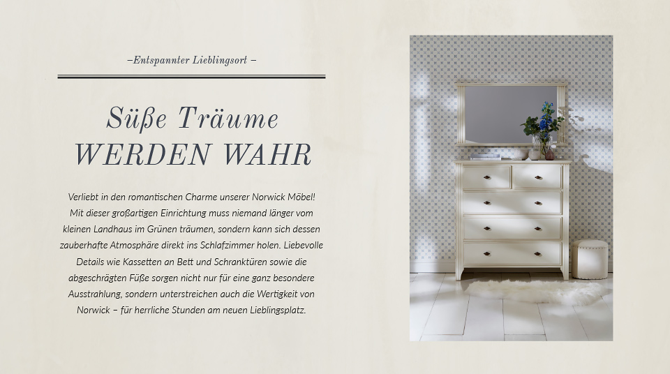 Die Calverton Kollektion macht Ihr Zuhause zu einem besonders lebendigen Ort. Zarte, durchlässige Lasuren bringen die natürliche Schönheit der Holz-maserungen zur Geltung und stehen im spannenden Kontrast zu den glatten, edlen Oberflächen aus Naturholz. Calverton ist lässiger Landhaus-Stil par excellence und in acht Farben erhältlich.