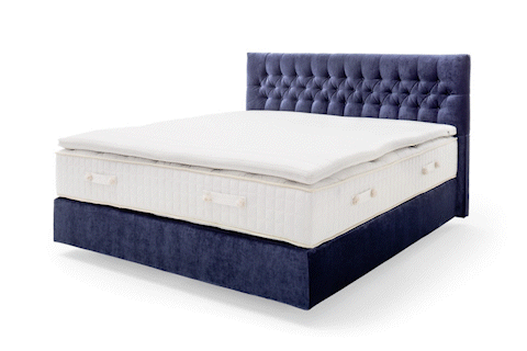 handgefertigtes geheftetes Chesterfieldkopfteil, Stoff dunkelblau, 100% Polyester, 31 cm hohe deluxe 7-Zonen-Taschenfederkernmatratze von Hand gearbeitet mit aufwändiger Polsterung und Knopfheftung mit dem Feeling eines Toppers, Fuß schwarz, schwebende Optik, Liegefläche ca. 180/200 cm, BHT 190/112/215 cm, Aktionspreis 4.990,–, ohne Kissen, Deko, Lattenrost und Bettwaren.