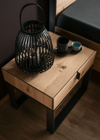Wildeiche gebürstet, Spaltholzabsetzung im Kopfteil inklusive LED-Beleuchtung, Metallkufe Lack graphit, Liegefläche 180×200 cm, BHT 184×100×212 cm, mit Beleuchtung 2.598,–, ohne LED-Beleuchtung 2.299,–, ohne Lattenrost, Matratzen, Bettwaren und Deko.