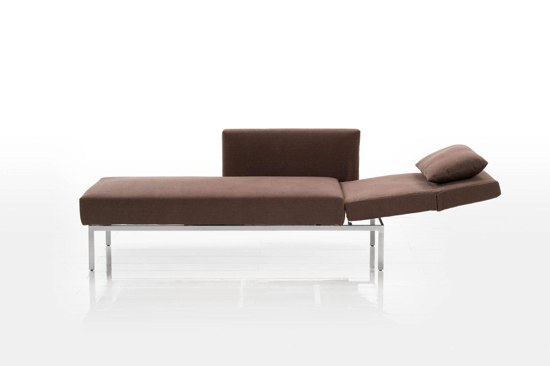 Eine Recamiere als Ruhepol für Mußestunden, stilsicher in Form und Funktion. Flexibel abklappbare Rücken- und Seitenlehne, anschmiegsame Polster, großes Seitenkissen, abziehbar, mobil durch Rollen am Kopfteil. Füße und Rollen wahlweise in Chrom oder Holz.
