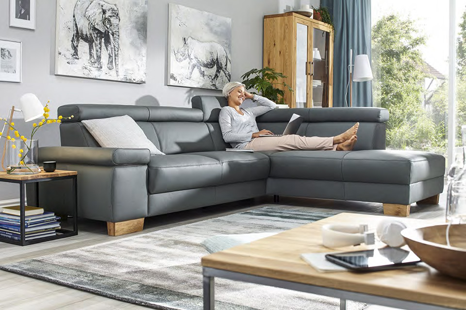 Leder anthrazit, best. aus: 2,5-Sitzer-Sofa mit Armlehne links, Eckenelement und Einsitzer mit Abschlussteil rechts, Füße: Eiche natur geölt, inkl. manueller Kopfstützenverstellung in den Rückenlehnen, BHT ca. 269×81×215 cm, 2.399,–, ohne Kissen