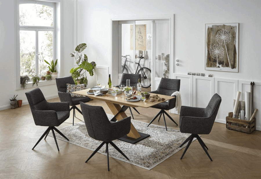 1. Esstisch 6663 mit Synchronauszug, Tischplatte Charakter-Eiche furniert, Gestell Charakter-Eiche furniert / Metall schwarz, Verlängerungsplatte ca. 40 cm, BHT ca. 180(220)x76x90 cm, 1698.-*