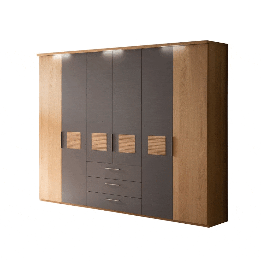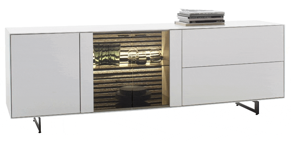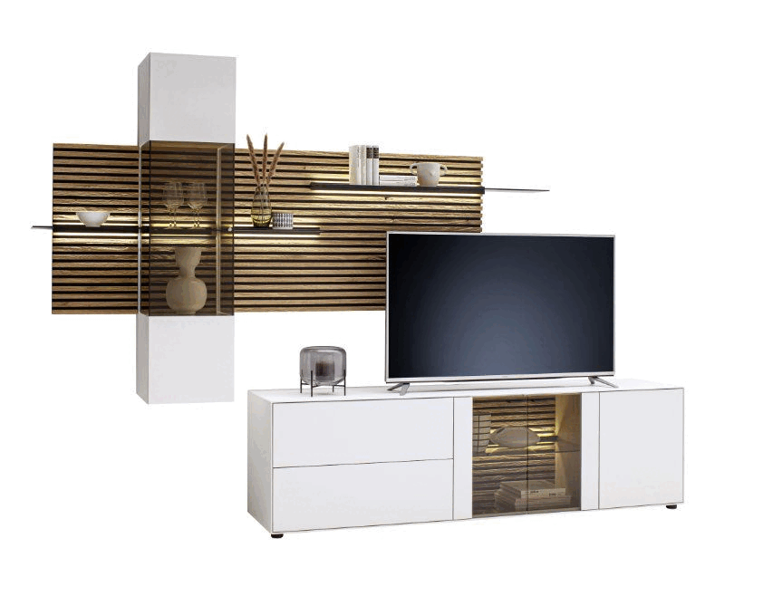 Wir sind schon ein bisschen stolz darauf, den Holzlamellen-Trend als Erste auf eine Möbelserie übertragen zu haben. Wer wagt, gewinnt, denn die Kombination aus glattem Lack und reliefartigen Eichenlamellen hat überrascht und überzeugt.