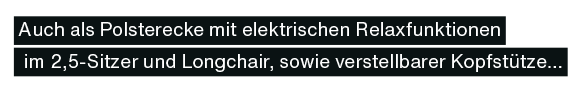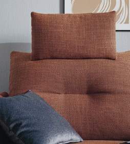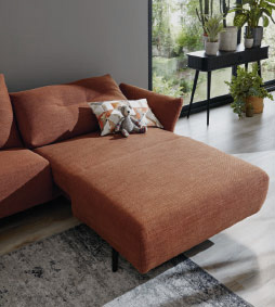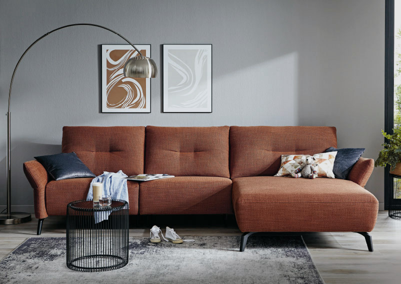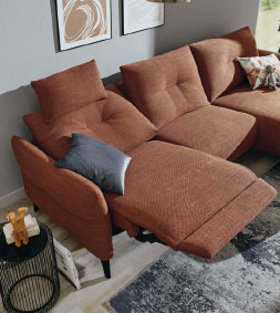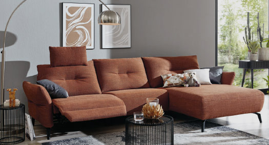 in Stoff kupfer, 100% Polyester, Füße Metall schwarz, Armlehnen klappbar, bestehend aus: 2,5-Sitzer mit Armlehne links, XL-Longchair mit Armlehne rechts, BHT ca. 302x88x166 cm, 1998.- auch als Variante mit elektrischer Relaxfunktion im 2,5-Sitzer inkl. Kopfstütze mit Rasterbeschlag, Longchair mit elektrischer Relaxfunktion, 3498.-
