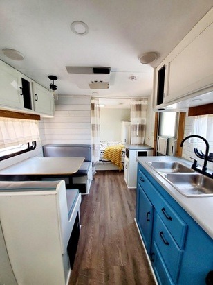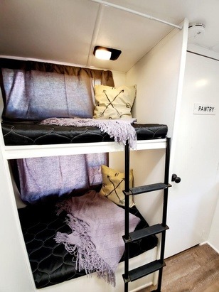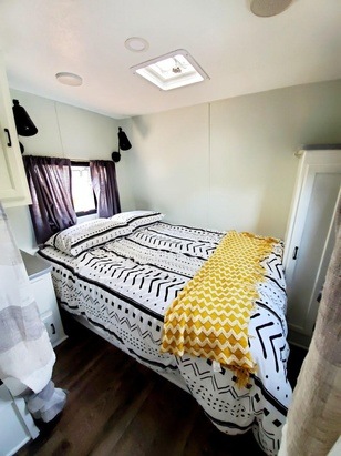 Gypsy has a full bathroom with a tub and skylight. With bunk beds, a table that converts to a bed and a Queen size master bed, Gypsy comfortably sleeps a family of 5!We want you to have a wonderful stay in Gypsy so we provide pretty much all you would need to start your adventure! Really all you need to bring is food, clothes, toiletries and sleeping bags for the bunkhouse!!